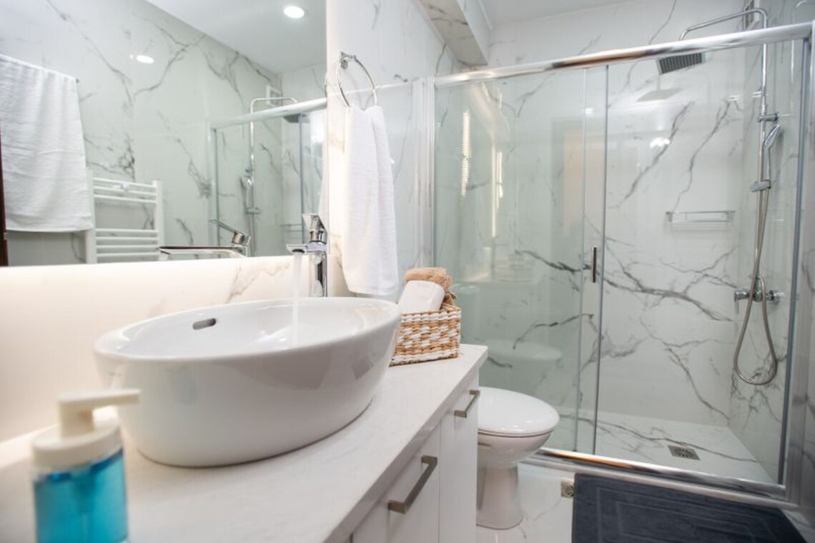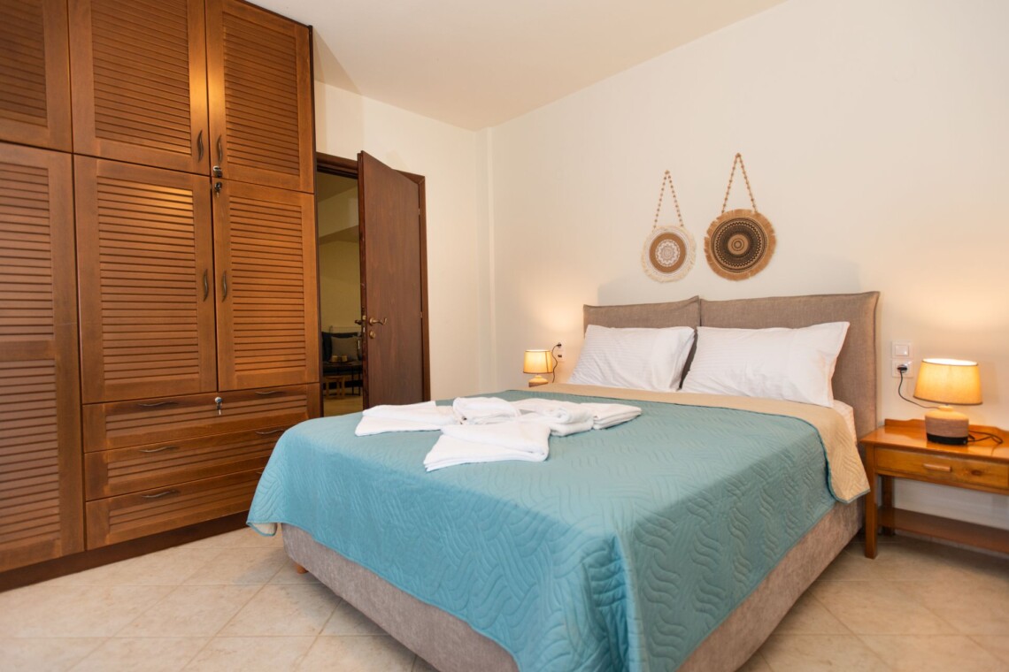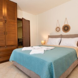 The master bedroom with a double bed has a lovely view of the back garden and the mountains. On the other side of the apartment is the second, blind bedroom with a double bed.