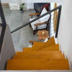 The third bedroom provides complete privacy and is situated on the lower level in a separate studio. Accessible from the outside via steps and with its own private entrance, the studio includes a bedroom with a queen-size bed and a bathroom with a shower and toilet.