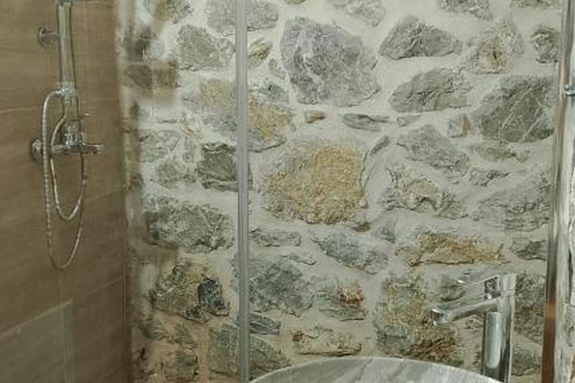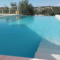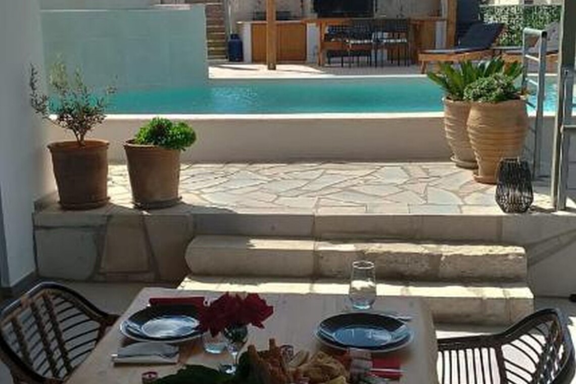 Guests can enjoy several outdoor areas around the villa. At the front of the house, there is a patio with a comfortable seating area on the ground level, while the barbecue area is located next to the villa. The 16 sq m saltwater swimming pool is accompanied by an outdoor shower, with sun loungers placed beside the pool or under the shade of an old olive tree. The lower level also features a large seating area directly in front of the villa.