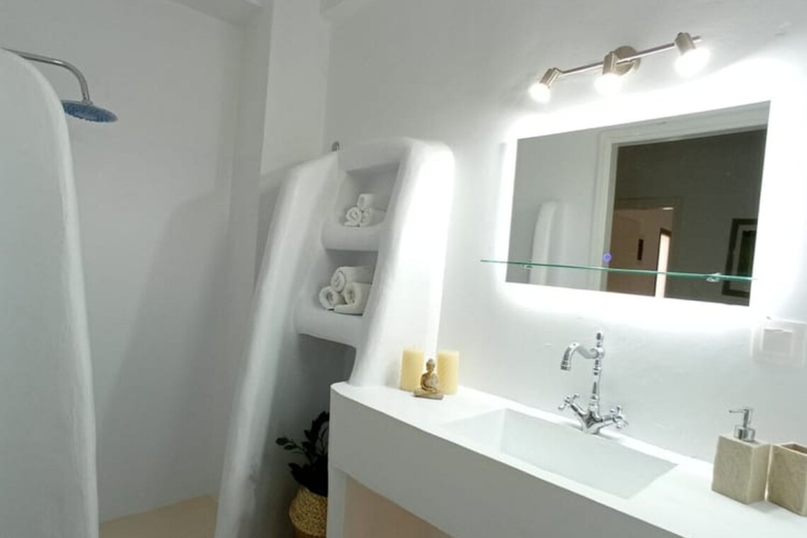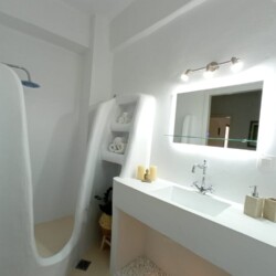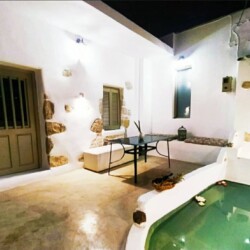 Venturing outside, you’ll discover the refreshing jacuzzi, though unheated, offers a rejuvenating retreat amidst the serenity of the surroundings. Outdoor couches and a small table invite relaxation creating memorable moments under the open sky. Enclosing the ground floor are sturdy walls, ensuring a sense of privacy and seclusion within this welcoming abode.
