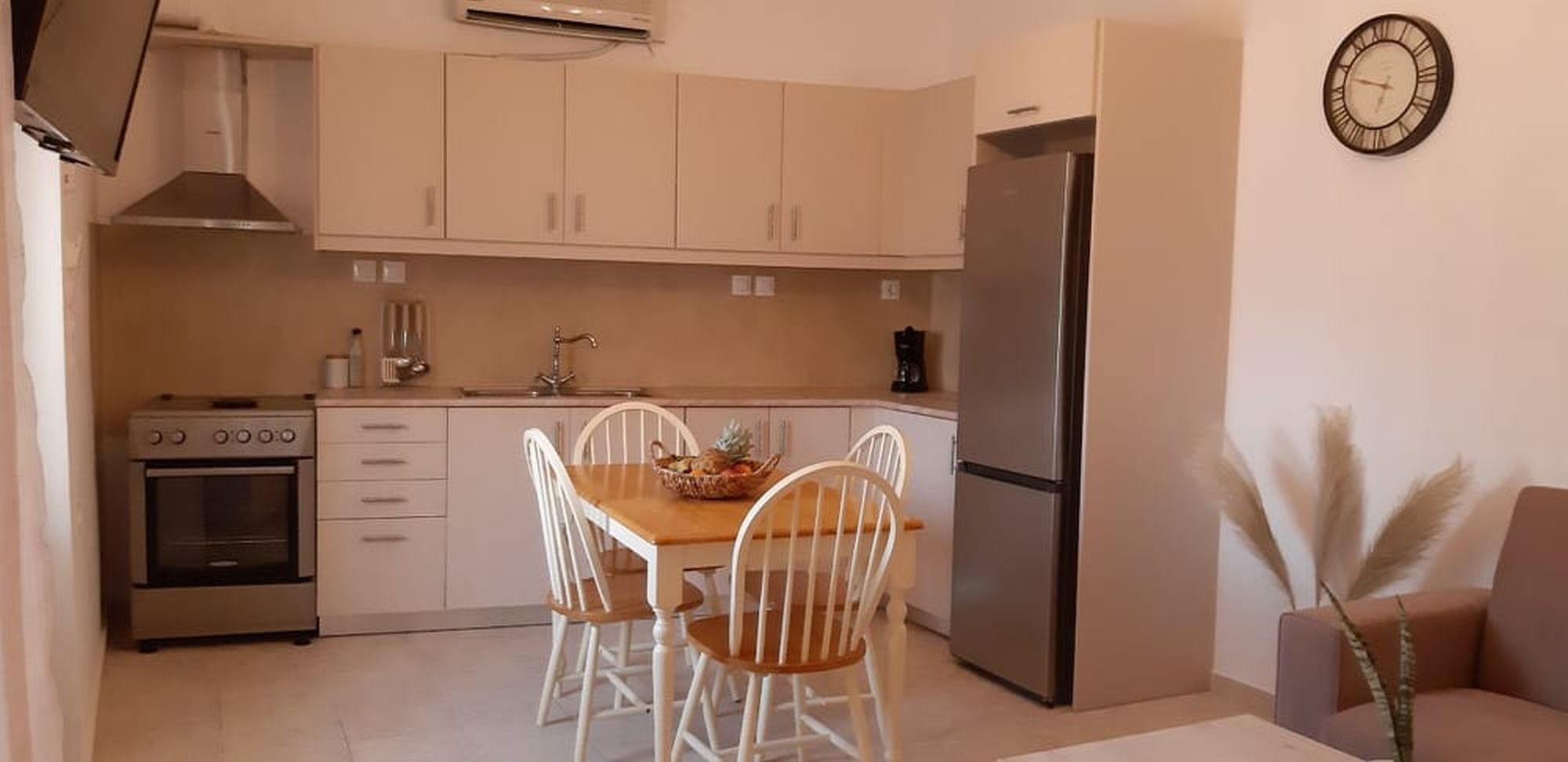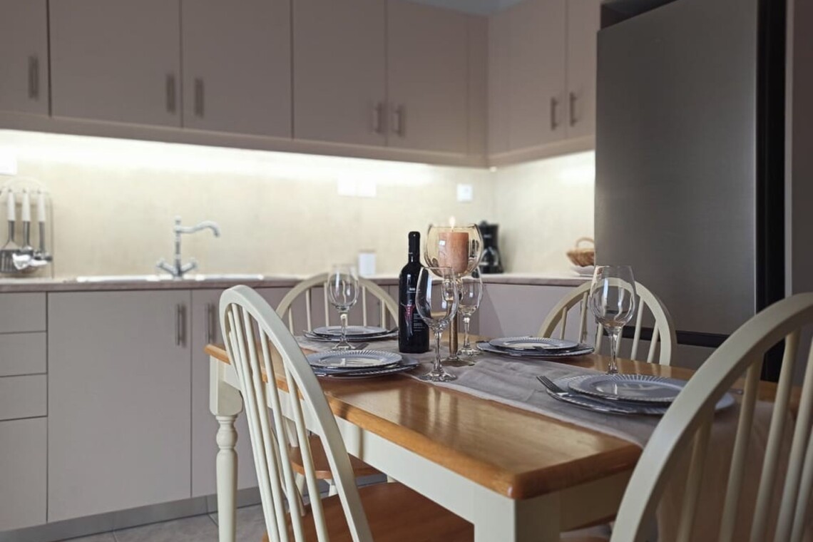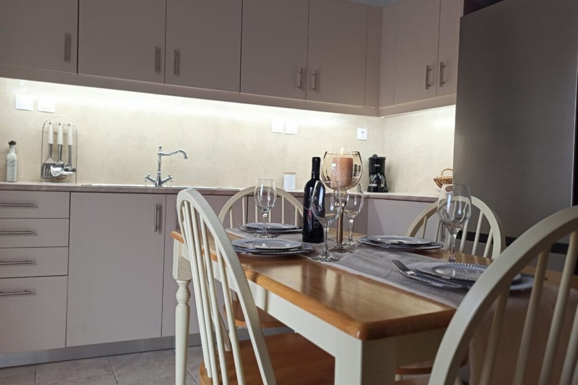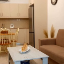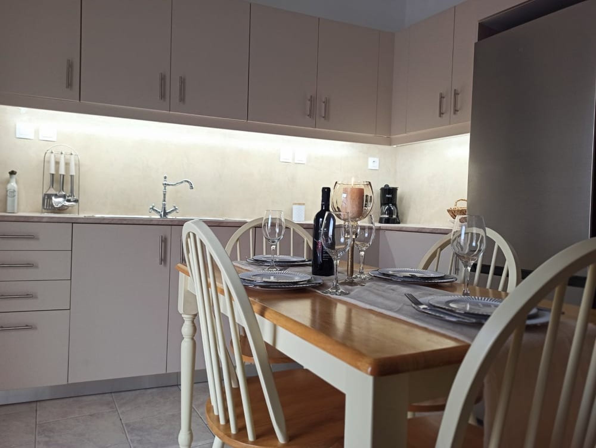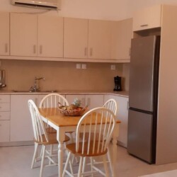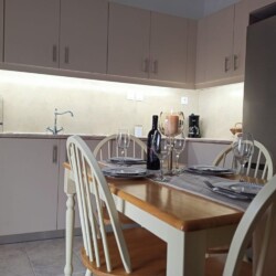 As you step into this charming house, you’re greeted by a sense of warmth and comfort that immediately puts you at ease. The ground floor opens up to a fully equipped kitchen, adorned with modern appliances and bathed in light colors that create a soothing atmosphere. A dining table with four chairs sits invitingly, promising delightful meals and shared conversations.