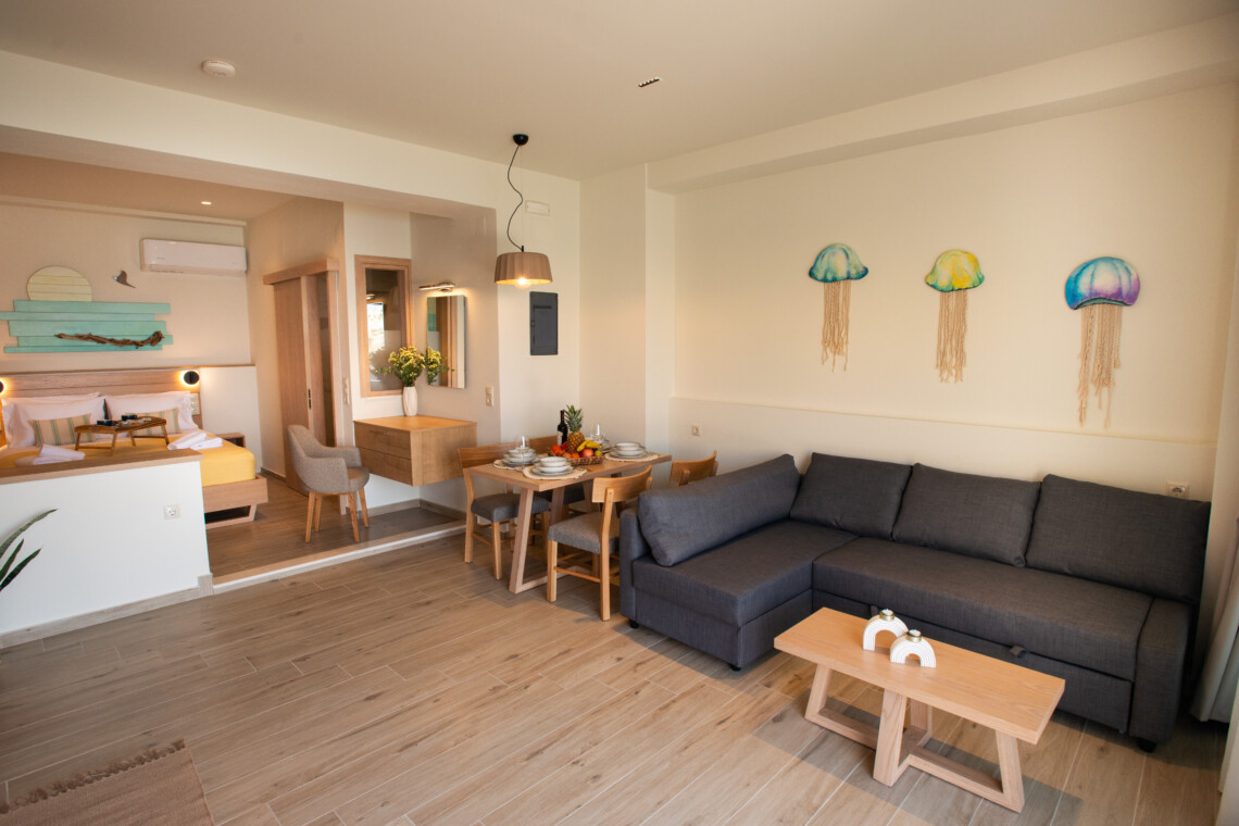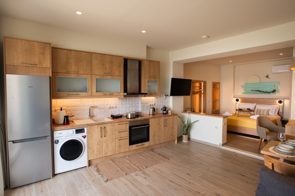 Step onto the private balcony, where the salty breeze and breathtaking views of the endless blue create an atmosphere of pure relaxation. Whether you’re enjoying a quiet morning coffee or unwinding in the evening with a glass of wine, Studio Meltemi promises an unforgettable experience in one of Crete’s most iconic coastal destinations.