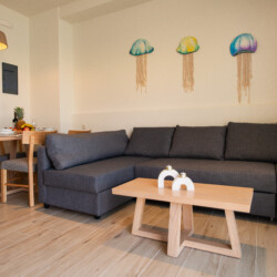 The inviting double bed faces the sea, allowing you to wake up to the soothing sound of the waves. A comfortable couch provides extra sleeping space for two children, making it an ideal escape for couples or small families. The fully equipped kitchen offers everything you need to prepare meals, while the modern bathroom, featuring sleek finishes, adds a touch of luxury to your stay.