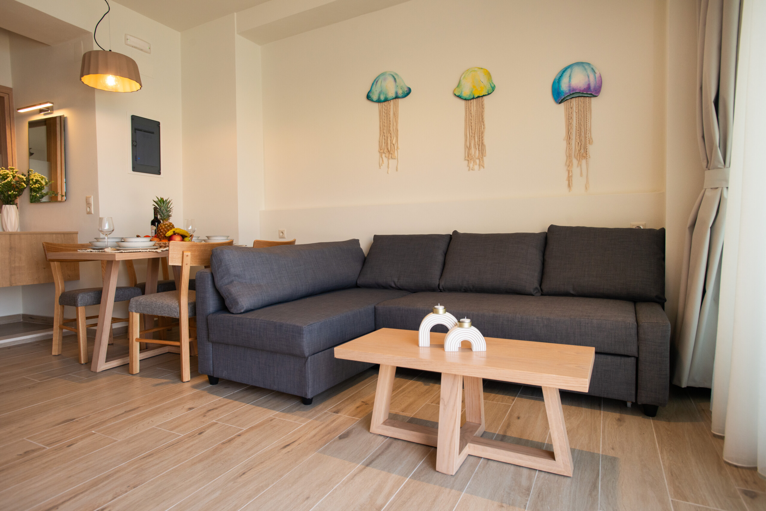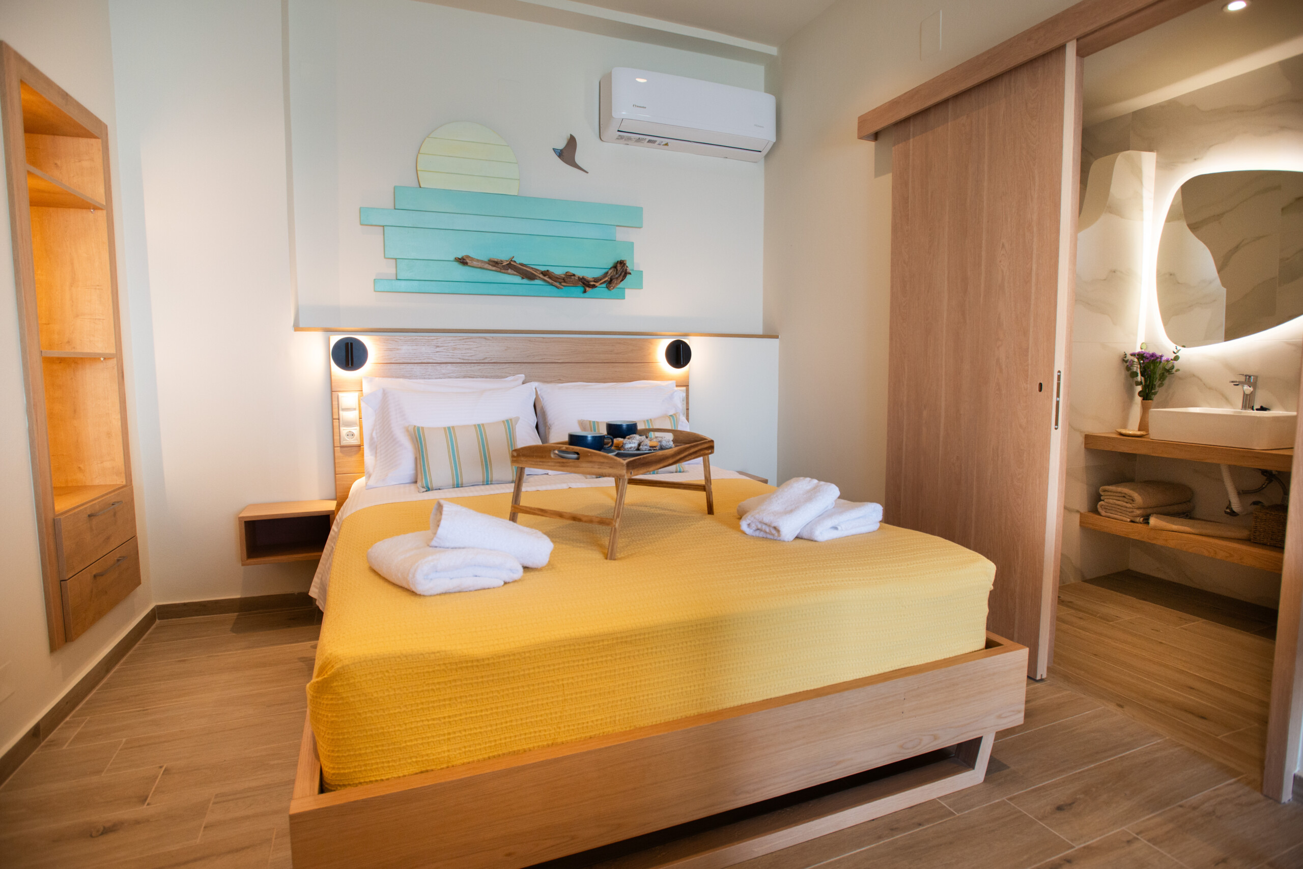 Step into Studio Meltemi, a tranquil beachfront retreat in the heart of Matala, where the colors of the sea blend seamlessly with the warm, earthy tones of the interior. This elegant studio is designed with soft beige, natural wood accents, and deep blue details that mirror the mesmerizing views of the Mediterranean just outside your window. The space is bathed in natural light, enhanced by dark shadings that perfectly balance brightness and privacy.